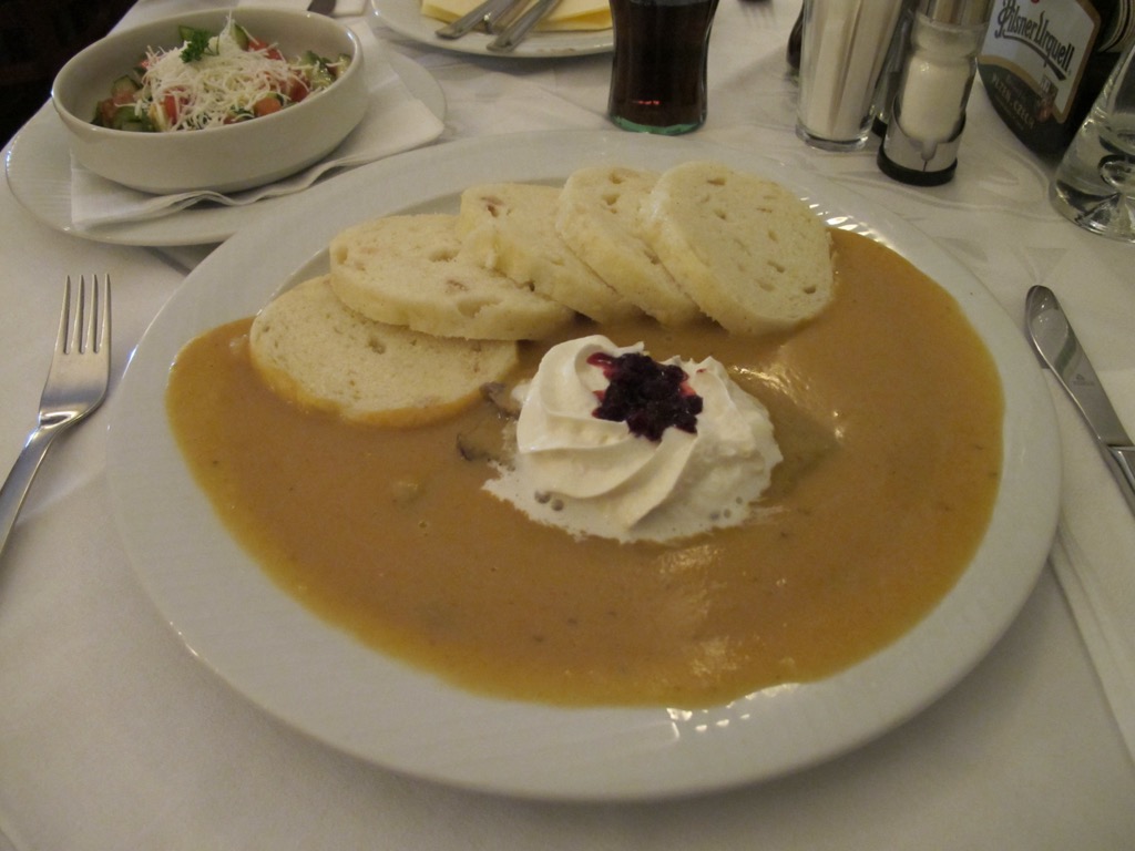 Roast beef with cream sauce and dumplings.