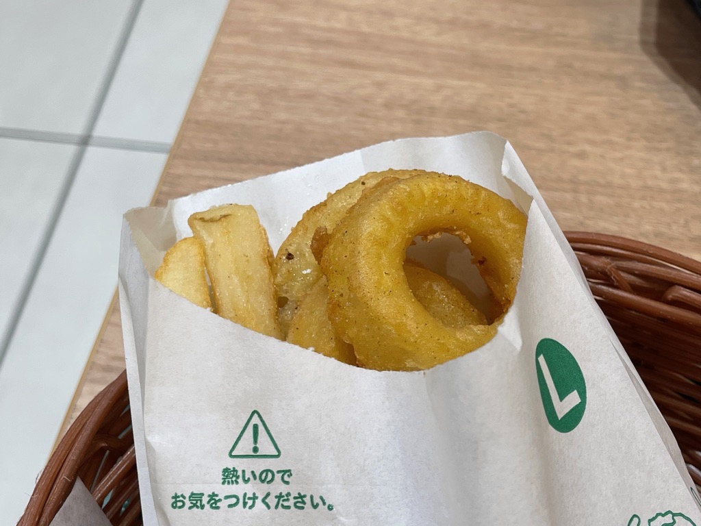 | Mos Burger. Onion Potato Set (onion rings and French fries). The fries are okay. The onion rings should be crispier. ¥990, $6.75. |